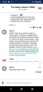I took some time to hack on Tchap again. This time I disabled virus scanning of thumbnails and downloads in Tchap to be able to see avatars. I also wrote a non-scanning virus scanner API implementation to be able to see files, pictures and videos that are sent. The updated Tchap can be found at https://github.com/14mRh4X0r/tchap-android, the virus scanner API implementation at https://git.snt.utwente.nl/14mRh4X0r/tchap-media-scanner.