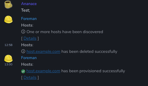 I started hacking - just a couple of hours or so ago - on a notification sender for The Foreman, a server orchestration system. So it can forward notifications to Matrix. https://github.com/ananace/foreman_notification_send