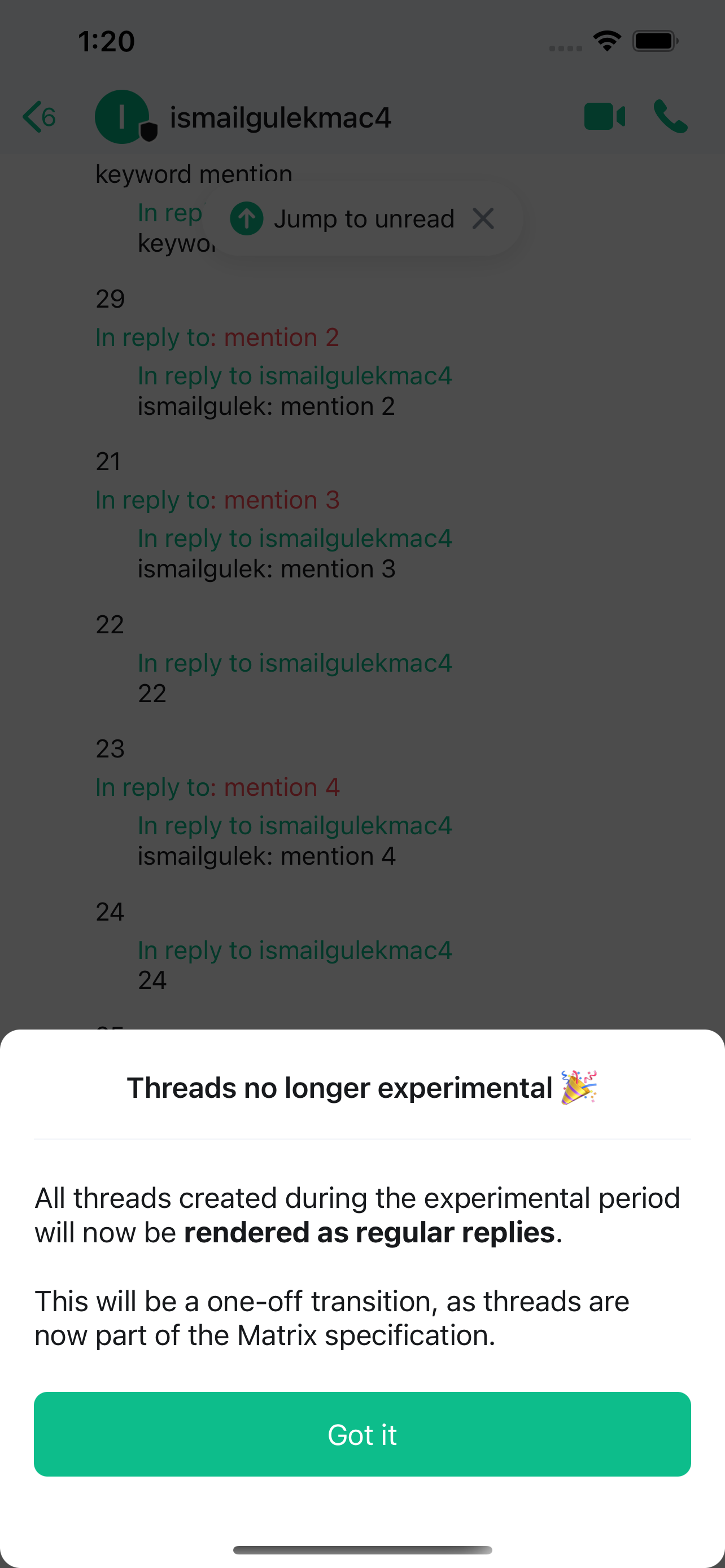 • Threads are levelling up and becoming driven by MSC3440, increasing their reliability and cross device consistency. If you're already using threads we'll automatically migrate them for you in the next release 1.4.6
