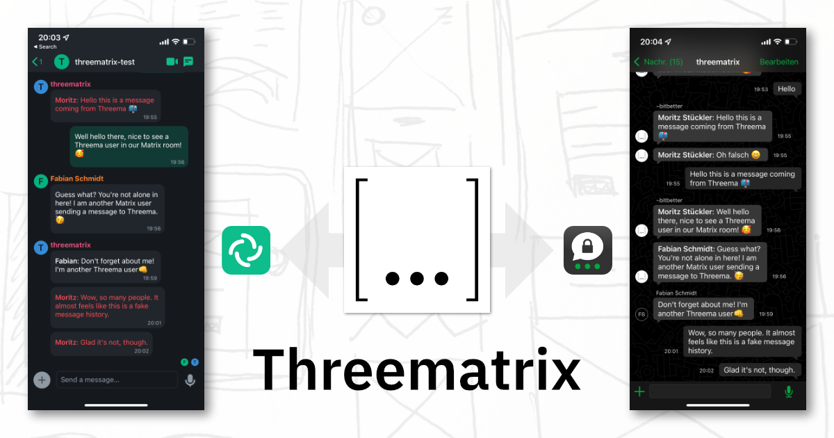 Say hello to a new bridge in Matrix universe (or rather fediverse): Threematrix. As you might've guessed from the name: It's a bridge between the Threema messenger and Matrix. Threema is a very popular messenger in europe, especially in German speaking countries (it's a swiss company). We've just released our very first alpha version โ it's a very simple bot bridge for now, but we have quite a lot of improvements on our todo list. Currently, it only works with the (paid) Threema Gateway API product, but we're trying to talk to Threema to come up with a more affordable hobbyist pricing model for bridge use. Feel free to follow our releases in the GitHub repo, follow our Mastodon account and join our Matrix room to stay up to date or ask any questions.