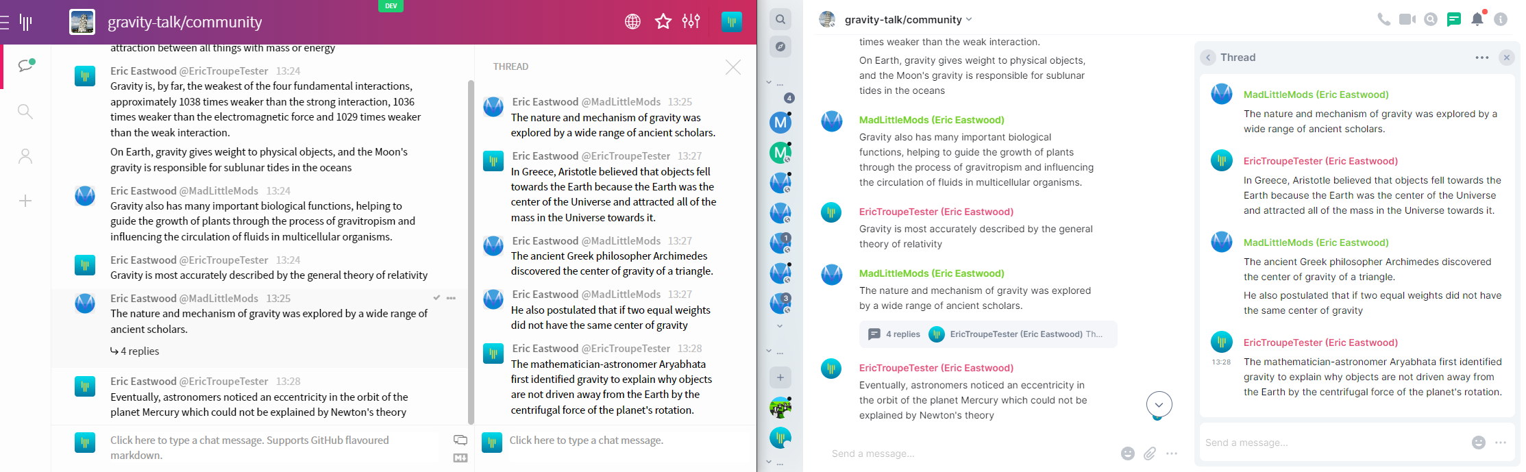 The first big exciting thing is that Gitter now bridges threaded conversations as native threads on Matrix (no more impedance mismatch)!