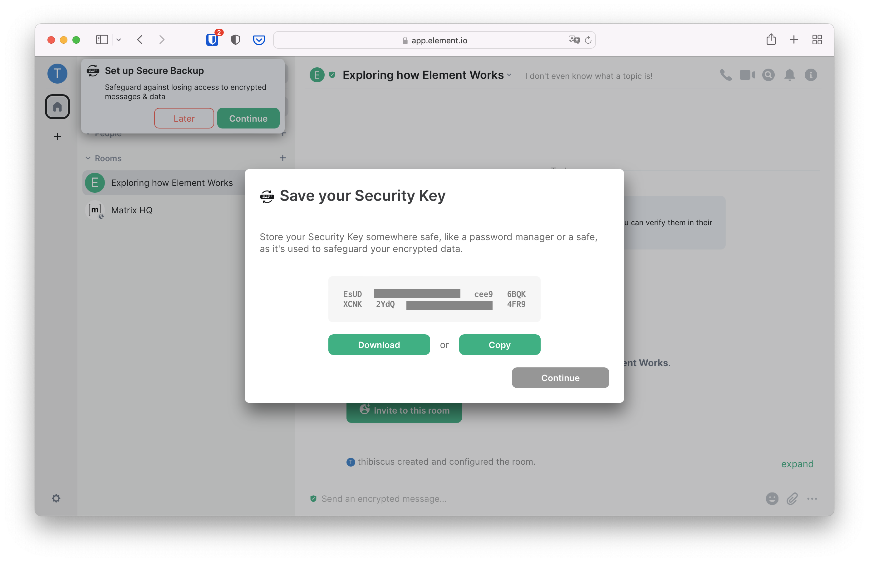 You can either let Element generate a Security Key that is difficult to guess to secure your digital safe, or pick your own. Unless you are an expert and know exactly what you are doing, in most cases it's better to let Element generate it for you. Leave "Generate a Security Key" ticked, and click on "Continue".