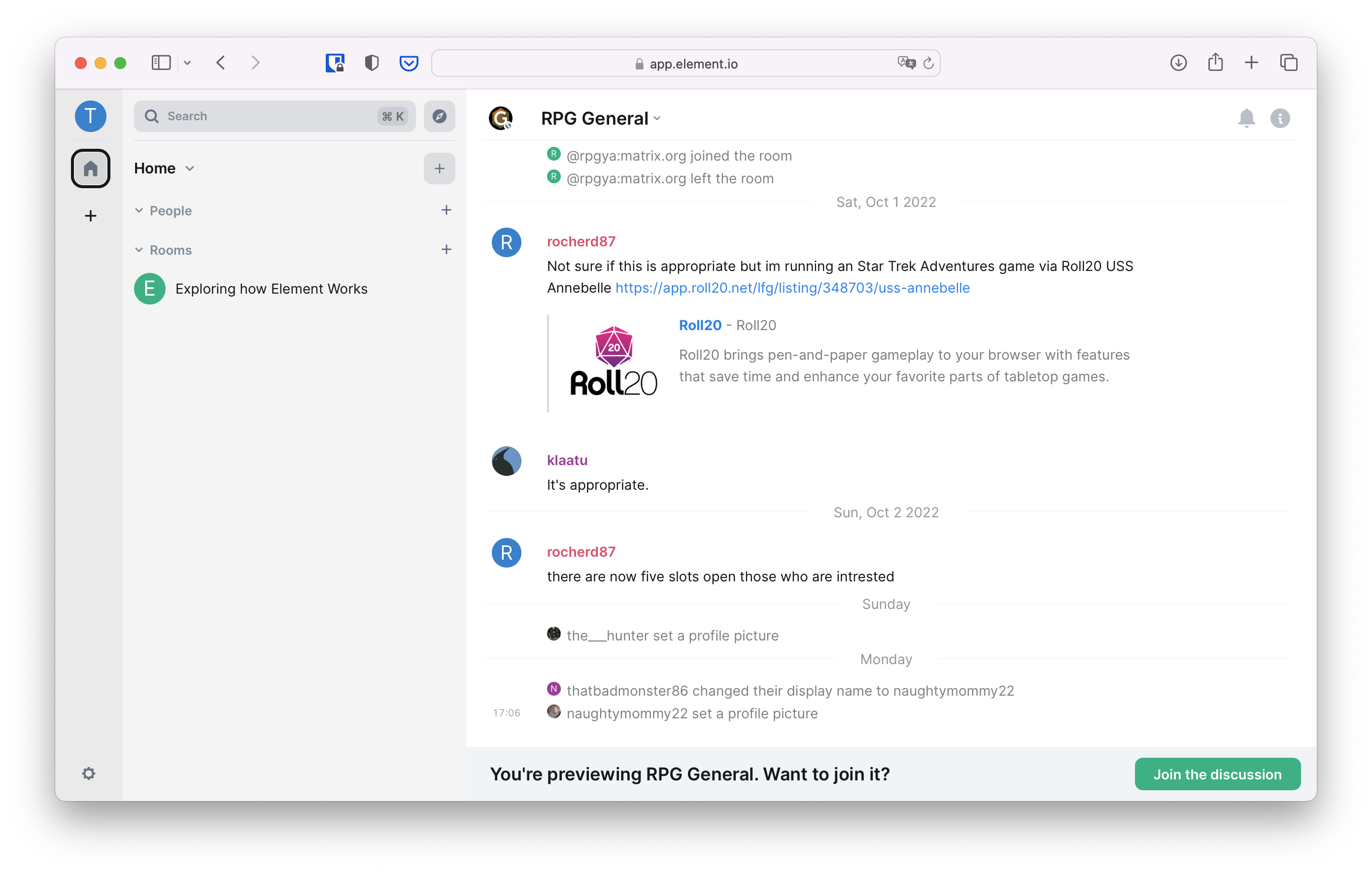 Once you have joined a Space, clicking on its icon on the leftmost bar will bring you to the index view of the space: you will see all the rooms contained in this space, and you will be able to join them by clicking on "Join".