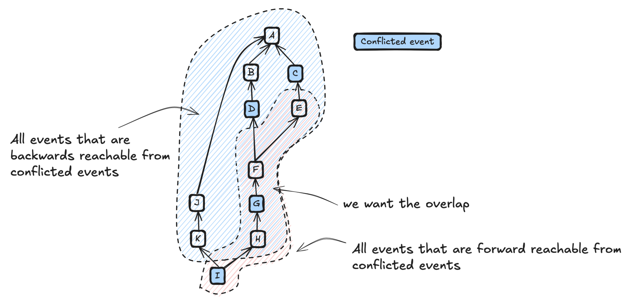 A simple but inefficient implementation works by taking each conflicted event and walking depth-first to the root of the graph. If the traversal encounters another conflicted event, then the events on that path are part of the conflicted subgraph. By walking depth first, the events on the path are naturally calculated as part of the walk, which saves time computing it.